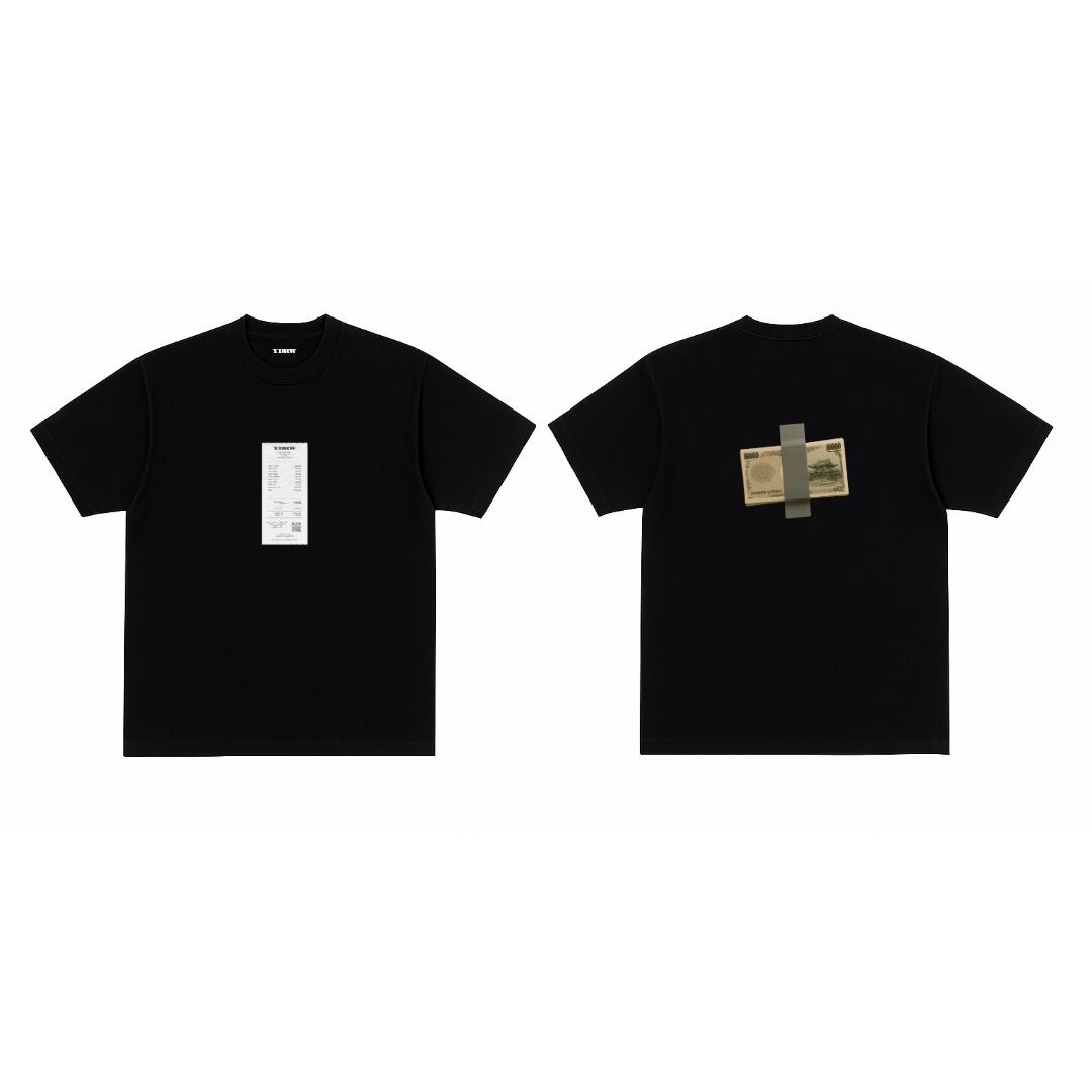 A bold yet minimal design featuring a “receipt” print on the front and a taped “banknote” graphic on the back.